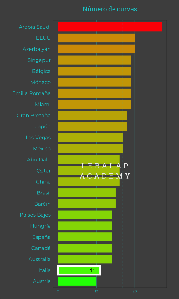 Repasemos datos clave que nos ayudan a contextualizar este circuito comparándolo con el resto. Estos datos están generados en simulador con las mismas condiciones en todos ellos para poder hacer la comparativa.