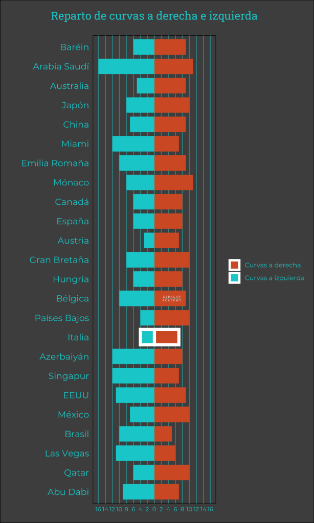 En cuanto al reparto de curvas, está bastante desequilibrado. Tenemos siete curvas a derecha y tan solo cuatro a izquierda. Además, curvas de baja velocidad tenemos un par a cada lado, ambas enlazadas en chicane. De velocidad media, que es donde está la chicha de este circuito, está muy desequilibrado: tenemos muchas más a derecha que a izquierda y, por lo tanto, los neumáticos del lado izquierdo suelen ser los que más se desgastan en Monza.