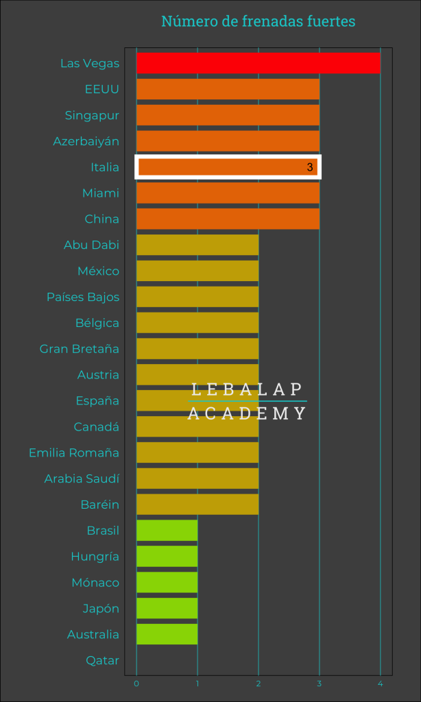 No es el circuito en el que más tiempo se vaya pisando el freno, ni mucho menos, es verdad, pero estas tres frenadas fuertes pueden marcar mucho la diferencia (que es donde se nota precisamente la eficiencia en la frenada y, por supuesto, la refrigeración de los frenos).