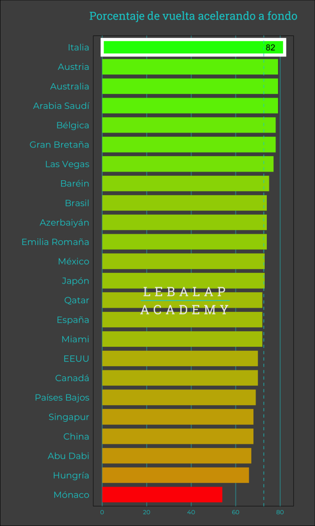 Ya para terminar, el porcentaje que vamos con el volante totalmente recto es el máximo. Y ¿dónde está Zandvoort? Abajo del todo. Lo mismo pasa si vemos el giro medio ¿dónde está Monza? Abajo del todo.