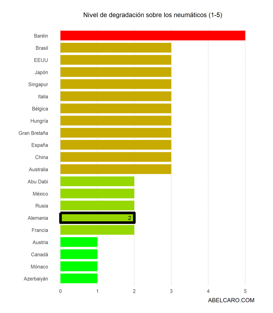 En resumen, se puede decir que es un circuito bastante equilibrado en cuanto a los neumáticos. La degradación es media-baja, por lo que no es muy común el blistering, y el grip es fundamental para no trompear o irse largo en las curvas rápidas y para tener buena tracción a la salida de las curvas más lentas.