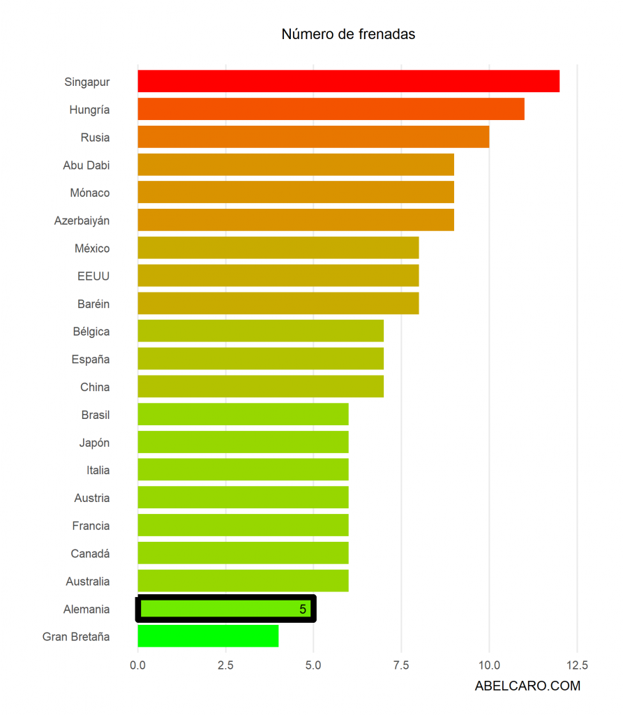 Esto tiene relación también con el tipo de curvas, que al ser la mayoría de velocidad media o alta, no se necesitan frenadas extremas.