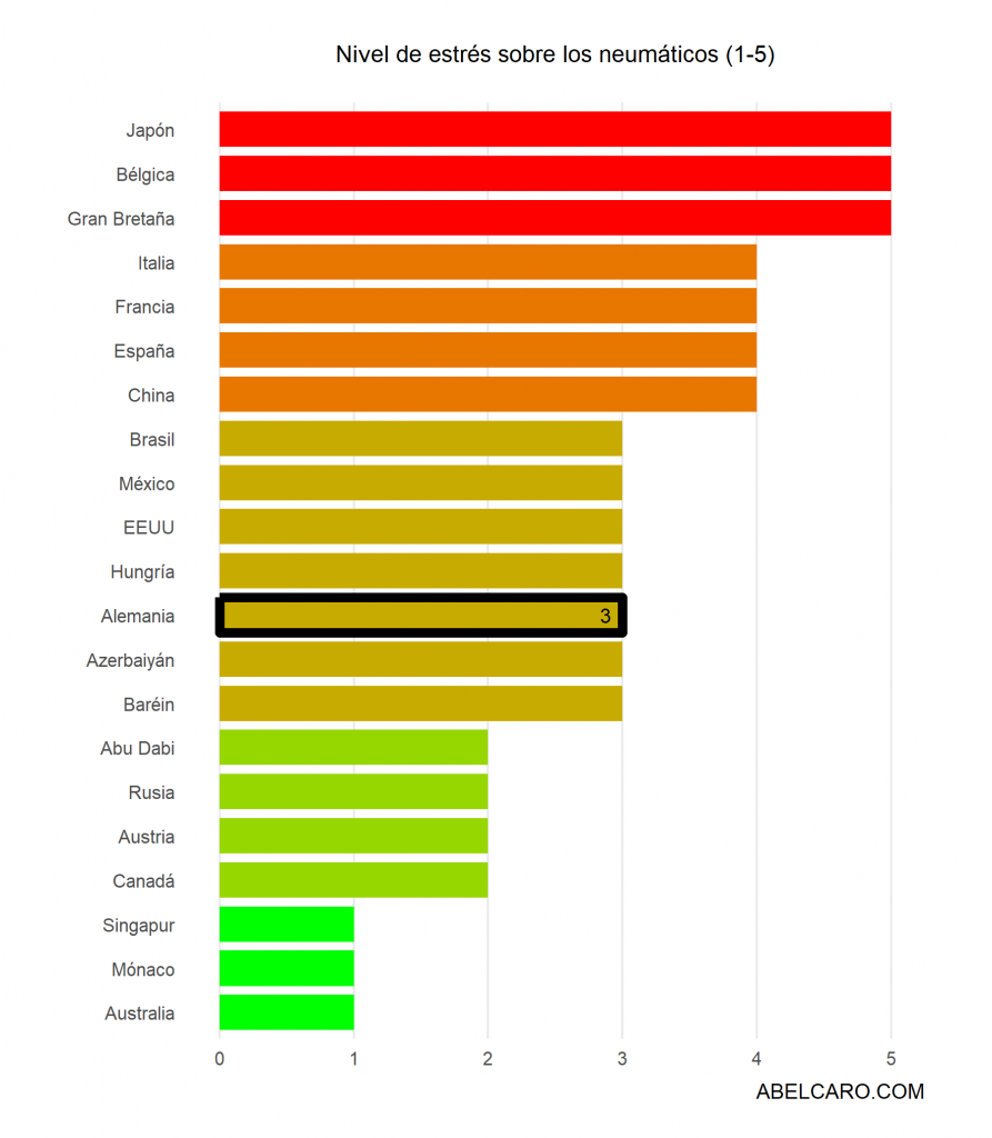 Como puedes ver, aunque hay varias curvas que se hacen a fondo, las fuerzas laterales son medias. Esto, por su parte, provoca que el estrés sufrido por los neumáticos también sea medio: