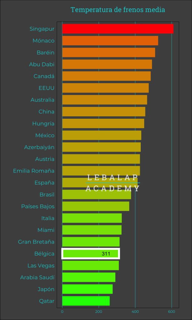 Dos de estas seis frenadas son especialmente fuertes. Tenemos picos en temperatura de los frenos ahí, porque ambas están muy cerca (última y primera frenadas), pero como podéis imaginar, en la temperatura de los frenos da igual que miremos la media, la máxima o la mínima, van a ser muy bajas, aunque no las más bajas de todo el calendario. Además, es muy fácil refrigerarlos porque como vamos a mucha velocidad, más aire entra en esos conductos de refrigeración y se refrigeran mejor todavía.