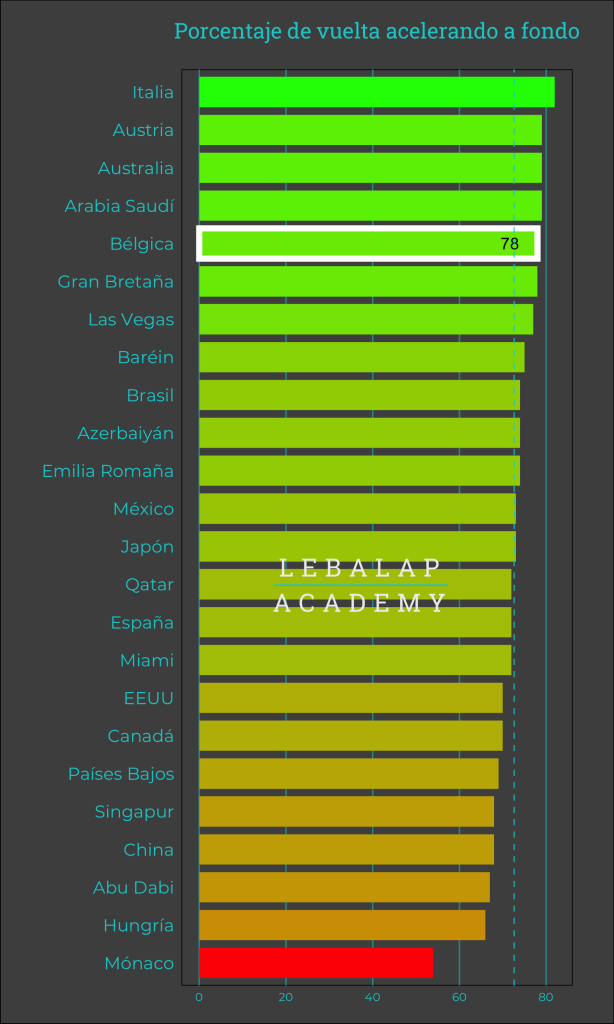 ¿Qué pasa con el otro pedal, el del acelerador? Como no puede ser de otra manera, el porcentaje que estamos acelerando a fondo es muy alto. Quizá se podía esperar aún más alto, pero es verdad que hay algunas curvas para las que hay que levantar e ir dando gas poquito a poco, aunque no tengamos curvas tan cerradas como en Hungría.