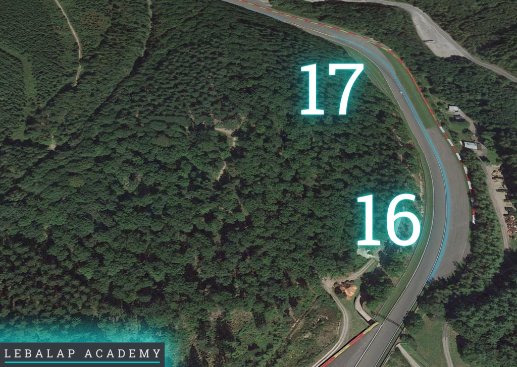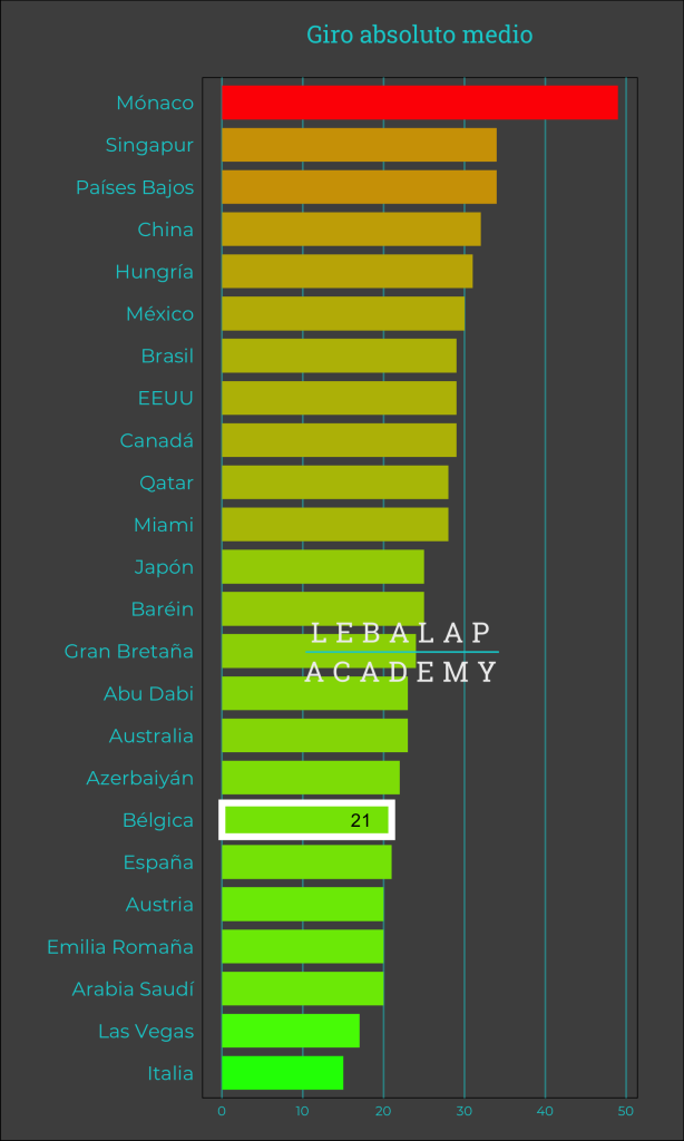 En cuanto a las curvas, tenemos 19. Son bastantes, pero es el circuito más largo. Así que, el ratio de curvas por kilómetro cobra especial importancia en Spa. Tenemos, no el ratio más bajo, pero casi casi. Es un circuito que sí, que tiene muchas curvas, pero está lejos en el ratio de densidad de circuitos como Hungría.